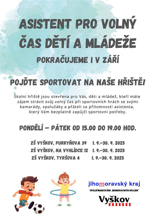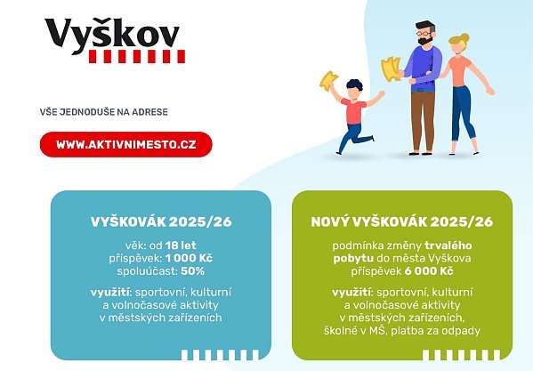 Stejné termíny (tedy pro podání žádosti o příspěvek a jeho využití) platí také pro druhý z nových programů: Vyškovák 2025/26. Okruhem příjemců příspěvku jsou Vyškované starší 18 let. Jeho výše je tisíc korun za podmínky spoluúčasti ve stejné výši. Znamená to tedy, že když dá dotyčný na volnočasové aktivity v zapojených příspěvkových organizacích Vyškova tisícovku ze svého, město mu k tomu přidá další tisícovku.